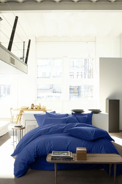 En percale de coton lavé : La technique « linge de lit lavé » offre une souplesse et une douceur maximales. Ce lavage pendant la fabrication donne au linge un aspect légèrement froissé hyper tendance. Plus besoin de la repasser ! La percale de coton lavé est un tissu souple et résistant de qualité supérieure grâce à son tissage ultra serré (80 fils/cm²) . Plus le nombre de fils/cm² est élevé, plus le tissage est de qualité.