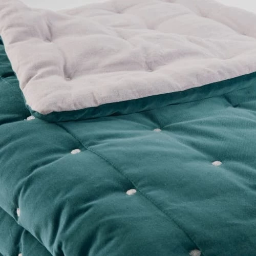 Ajoutez une couche de confort à votre lit avec le boutis réversible en velours CALIO. Vous allez adorer sa taille généreuse de 240×260 cm adaptée même pour les grands lits doubles, sa face 100% en coton et l’autre en mélange de coton et lin super doux. Sa touche d’originalité reste sa couleur vert canard qui relèvera avec style la décoration de votre pièce. Nous vous conseillons de l’assortir avec une parure de lit blanche et des taies d’oreillers jaunes. On invite ce boutis au bord du lit ?